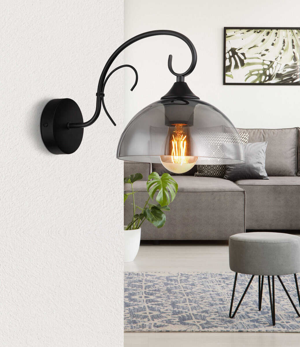 Ova zidna lampa serije COTTAGE ima crno mat metalno postolje i stakleno kućište boje dima. Svetlost lampe sija nadole. Dimenzije lampe su ŠxV: 200x220mm sa projekcijom od 340mm. Za svetiljku je potrebna sijalica E27 maksimalne snage 40W na naponu od 230V, ali ona nije uključena.