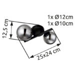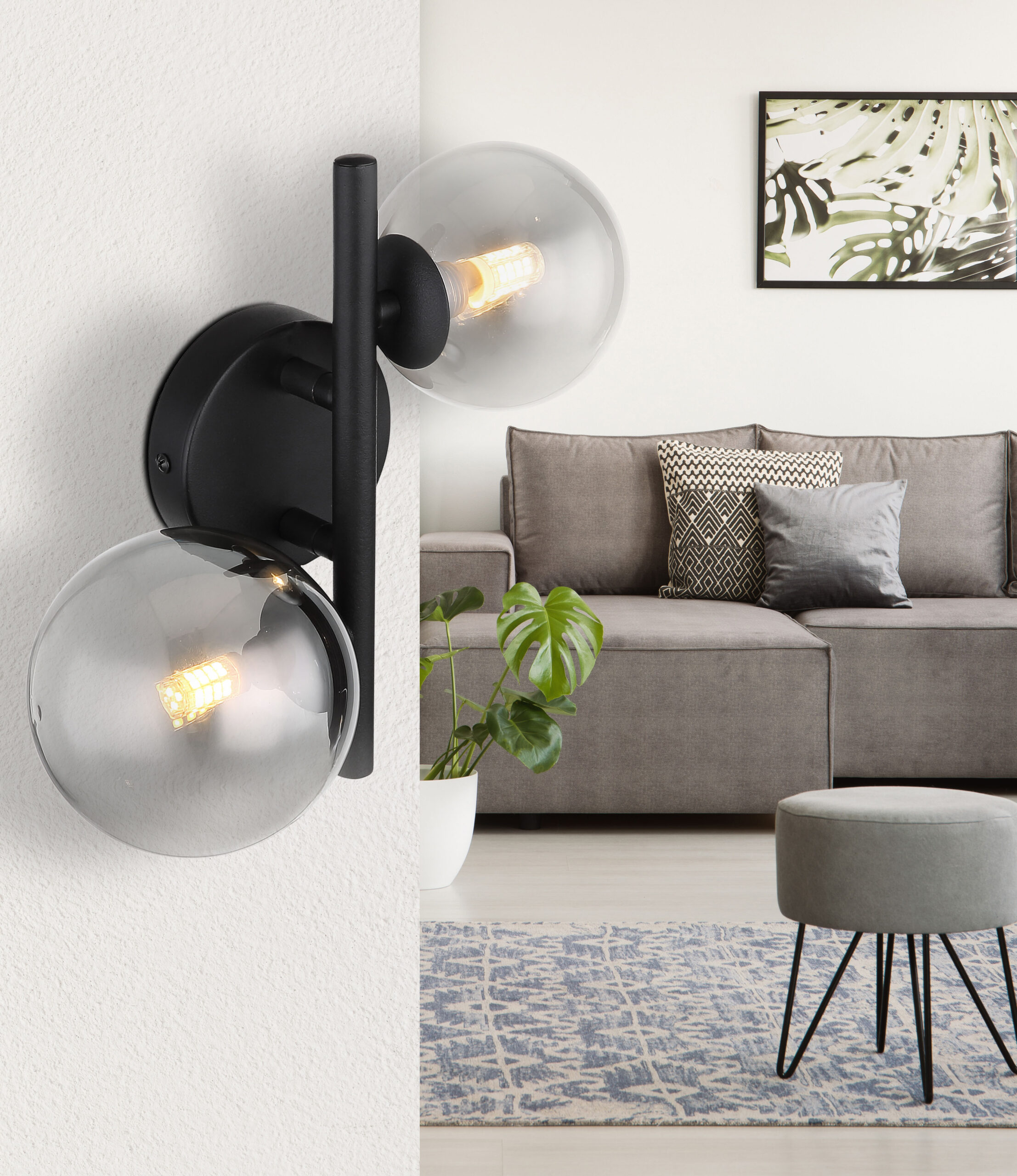 Moderna zidna lampa serije RIHA uvjerava sjajnim dizajnom i bojama. Iz okruglog zidnog nosača viri 12,5 cm duga metalna šipka u crnoj boji na kojoj se nalaze 2 G9 LED utičnice i svaka je prekrivena sjenilom u boji dima (Ø12 cm). G9 LED utičnice vam omogućavaju da sami odredite boju svjetla i svjetlinu do maksimalne snage od 3 vata. Zbog dugovečnosti i uštede energije preporučujemo LED sijalice.